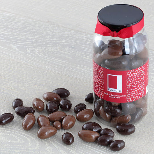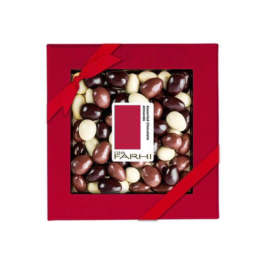Cherry Flavour Liqueur Dragees: Dark chocolate (60%) (cocoa mass, sugar, cocoa butter, emulsifier: soya lecithin, natural vanilla flavour), sugar, alcohol, maltodextrin, Arabic gum, rice starch, flavouring, colours: calcium carbonate (E170), carmine (E120), brilliant blue (E133), glazing agents: carnauba wax (E903), beeswax (E901).