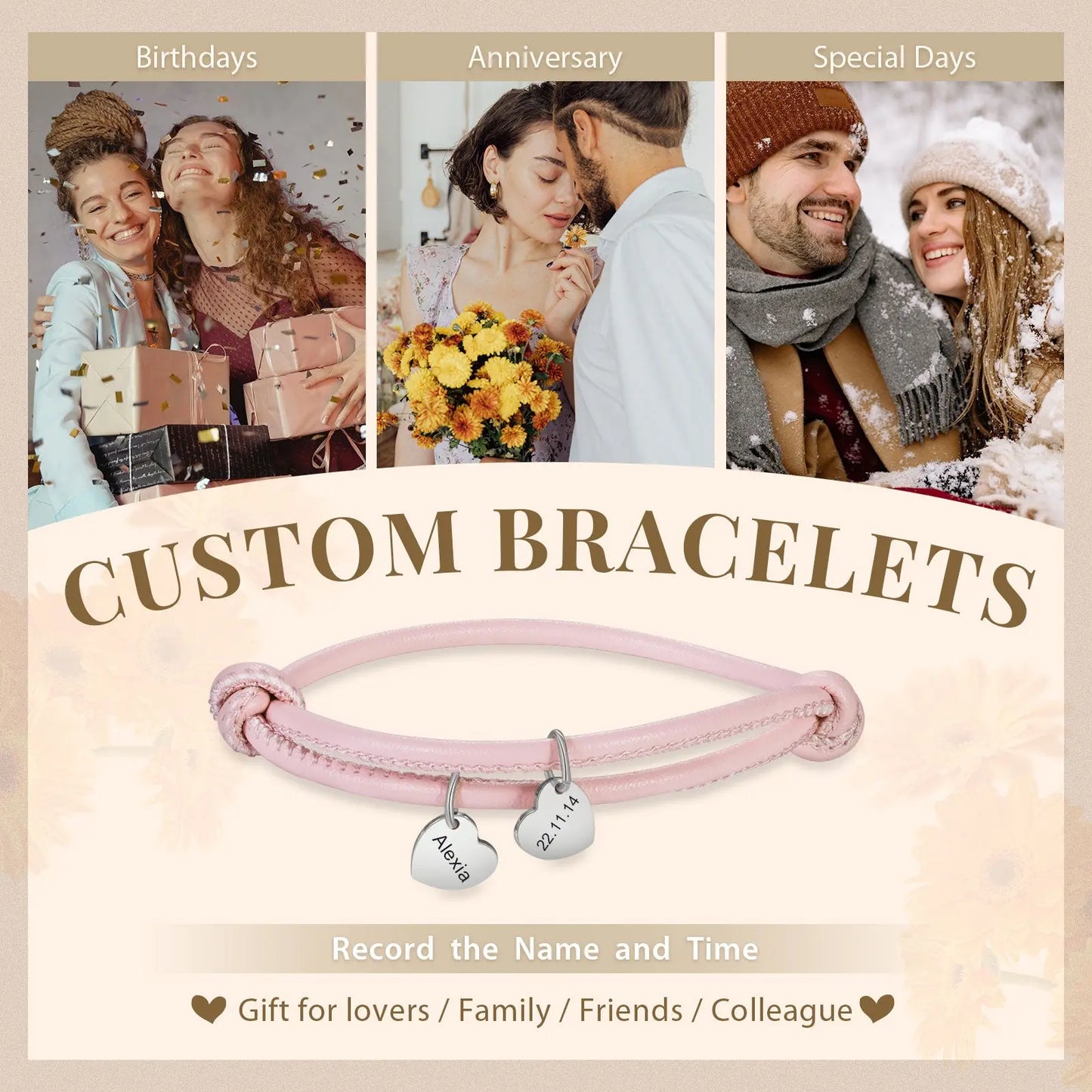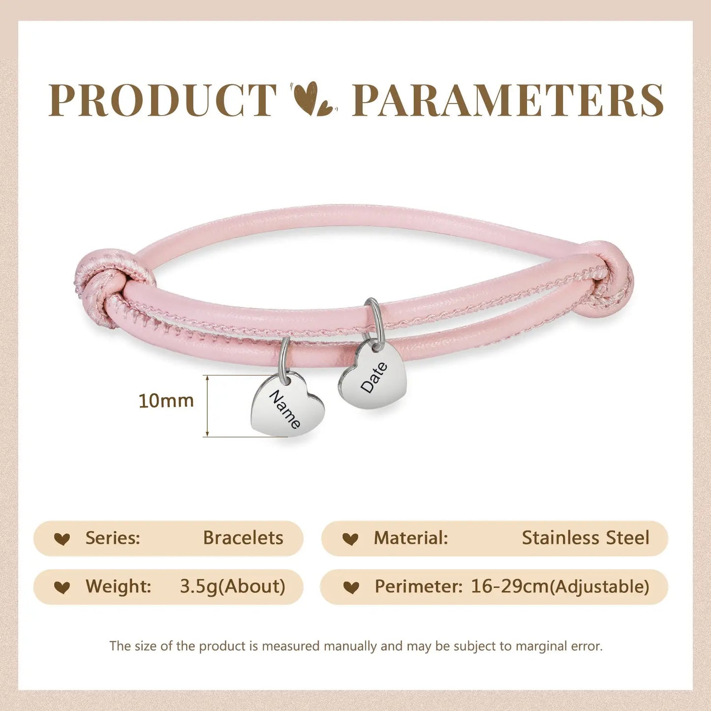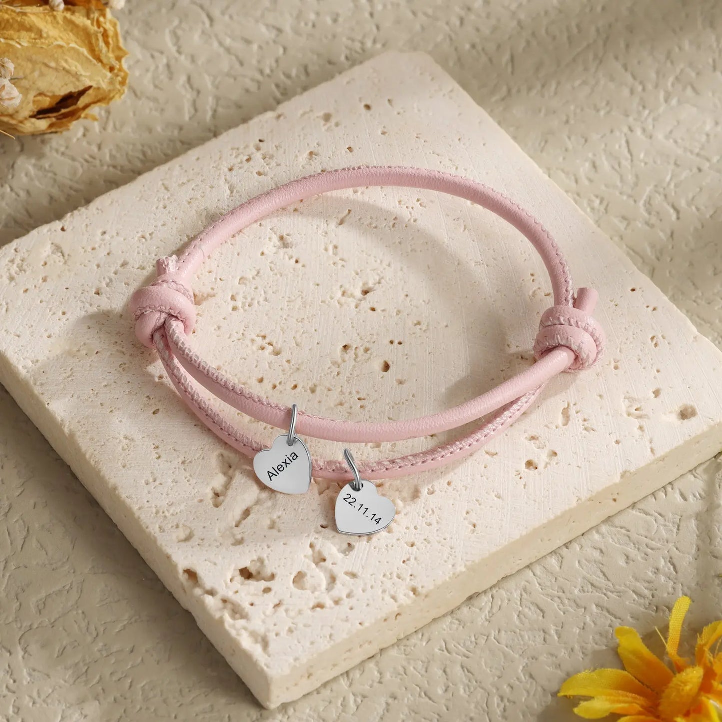Each elegant leather bracelet features two charming heart charms, ready to be engraved with her name and a significant date, such as the day she was born, her graduation date, or the date of a cherished memory. It’s a personalised piece that serves as a beautiful reminder of your love.