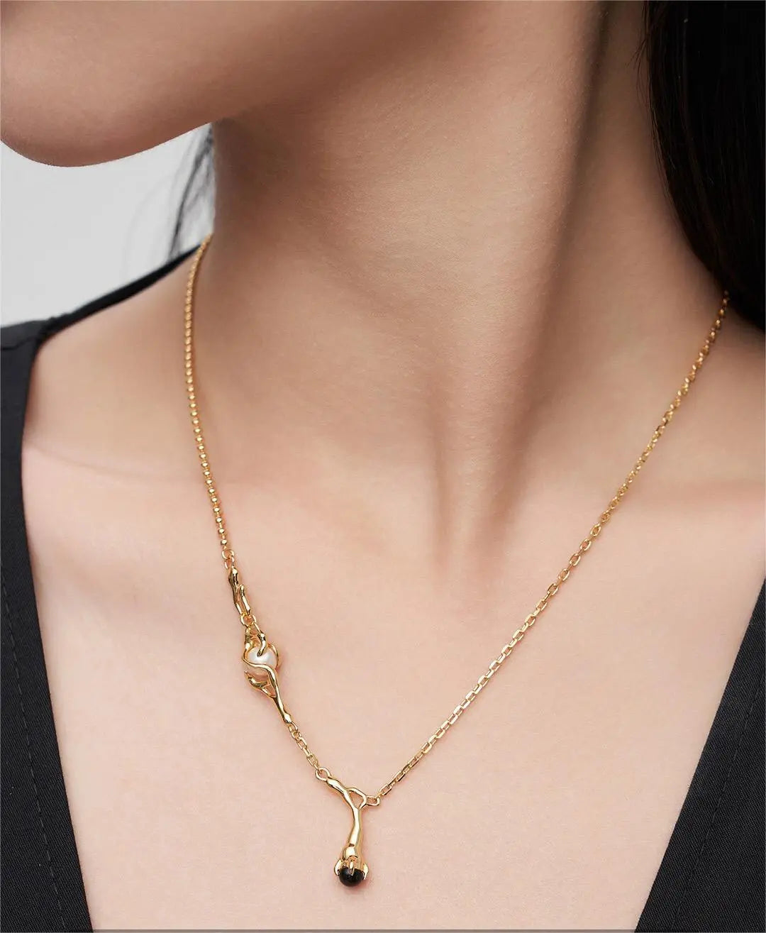 Natural Branch Style Pearl And Black Onyx Necklace-1