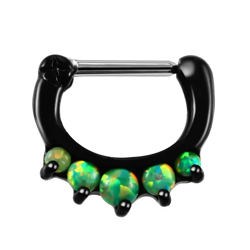 316 Surgical Steel Septum Clicker/Hanger in black with green Opal stones.