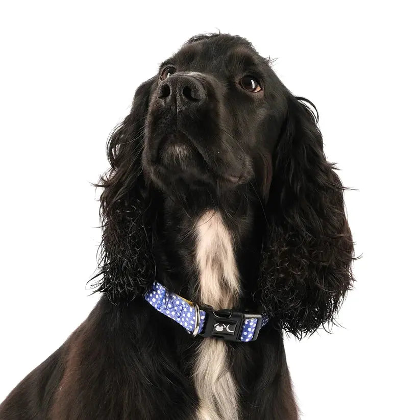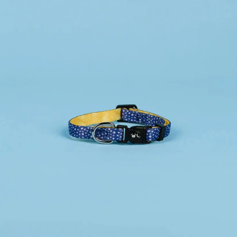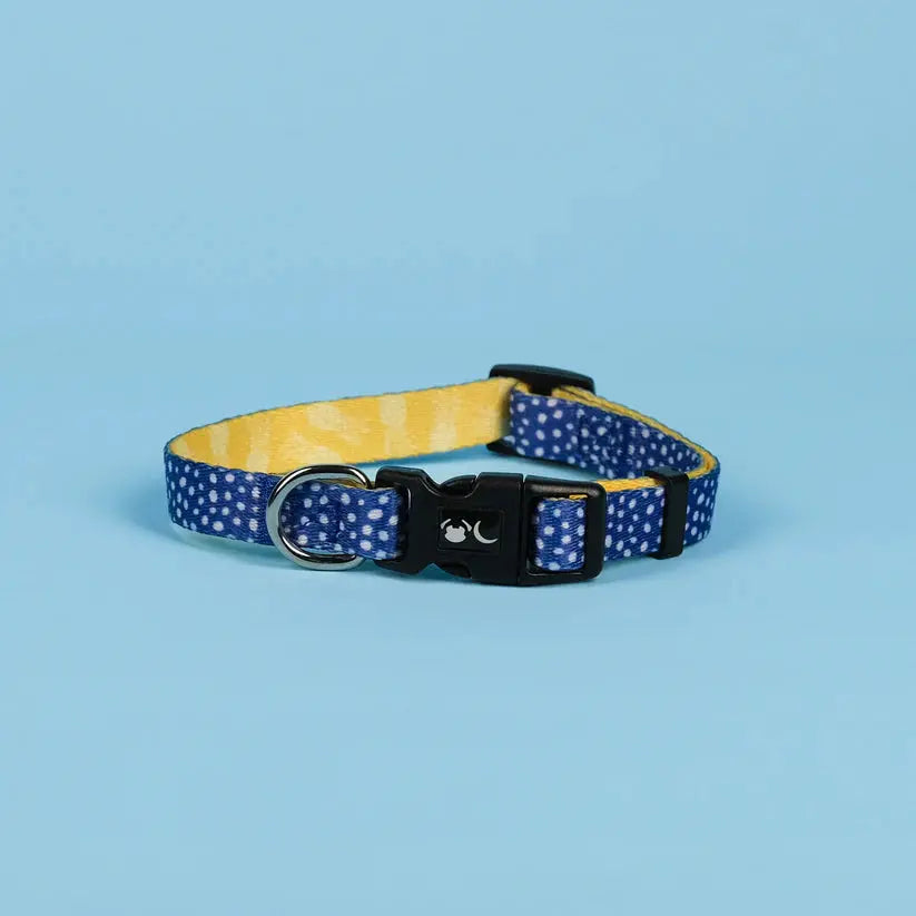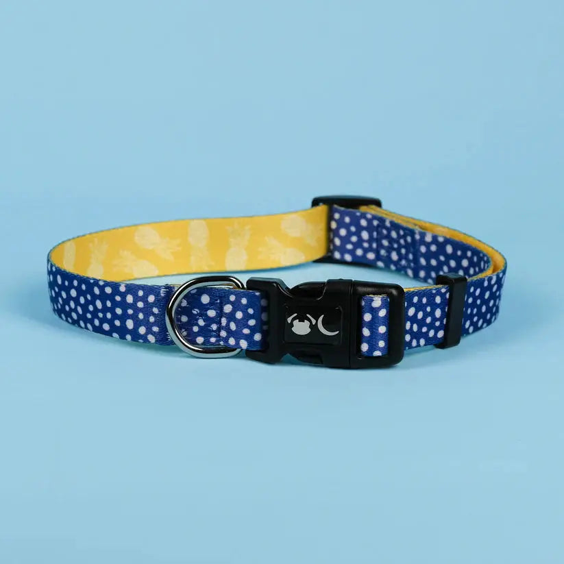 The Minnie Dog Collar brought to you by Neon Moon Pet Boutique, adds a little more fun to every dog, with a unique blue polka dot and yellow pineapple print.